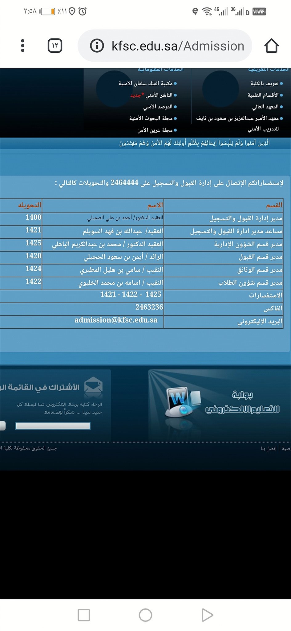مجلة كلية الملك خالد العسكرية. صفات الملك المؤسس عبد الله بن الحسين. أعلنت كلية الملك فهد الأمنية، نتائج القبول المبدئي الثاني لطالبي الالتحاق بالكلية لدورة الضباط الجامعيين (45) لعام 1436 هـ. موعد تقديم كلية الملك فهد الأمنية 1442 للجامعيين. ويحوي الفيديو شرح إجراءات القبول والتسجيل في كلية الملك فهد الامنية، مراحل التقديم في كلية الملك فهد الامنية، تفاصيل الكشف الطبي الأول والثاني.